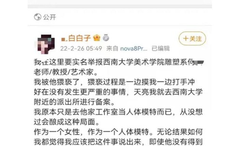 2月26日凌晨,人体模特白柏紫(化名)在微博实名举报西南大学美术学院雕塑系教授何某对其猥亵。据受害者白柏紫称,原本是去该教师工作室做人体模特,费用是300元,然而她在给何某当人体模特过程中惨遭袭胸,且何某当着她的面自慰(由于处于生理期,没有发生更严重的事情)。事后,她在固定相关证据后报警求助。