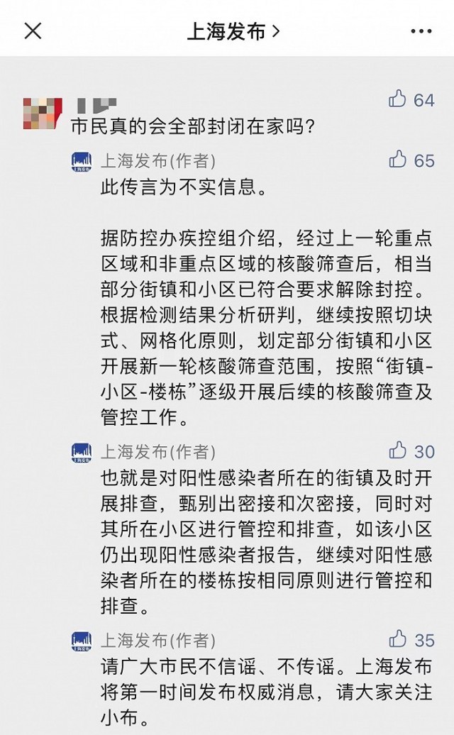 【上海市民全部封闭在家?官方辟谣】有网友在留言区询问:市民真的会全部封闭在家吗?