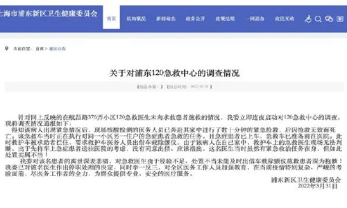 昨日,有网友发布微博称上海一例哮喘病人因120拒绝救援而病亡,列出详细时间线并伴有视频佐证,引发网友热议和讨论。今日,针对网上反映的在航昌路376弄小区120急救医生未向求救患者施救的情况,上海浦东新区卫健委发布对该事件调查情况,称当事医生当时虽然有紧急救治任务在身,但处置实属不当,已作出停职处理。上海浦东卫健委对该名患者的离世深表悲痛,对急救医生由于经验不足、处置不当未能及时出借车载除颤仪施救患者深为抱歉,对全区医务工作人员加强教育。