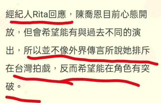 对于以上传闻,经纪人表示陈乔恩会希望能有与过去不同的演出,所以并不像外界传言所说她排斥在台湾拍戏,反而希望能在角色有突破。
