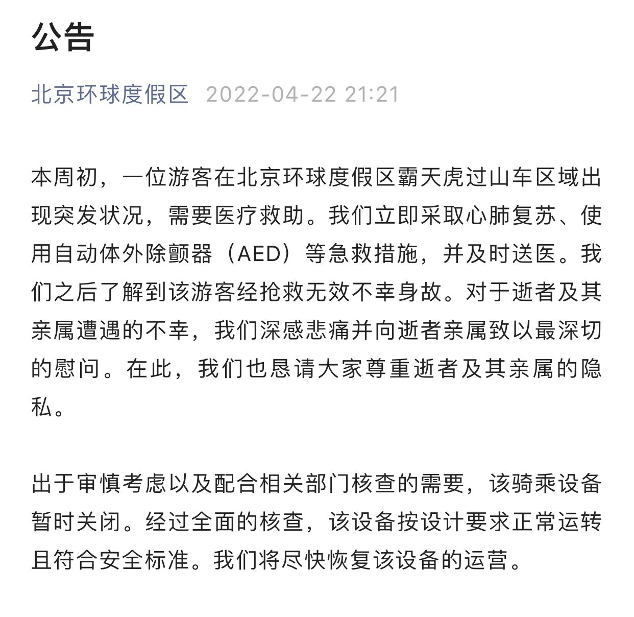 北京环球度假区官方微信号22日晚间发公告称,本周初,一位游客在北京环球度假区霸天虎过山车区域出现突发状况,需要医疗救助。北京环球度假区立即采取心肺复苏、使用自动体外除颤器(AED)等急救措施,并及时送医。北京环球度假区之后了解到该游客经抢救无效不幸身故。出于审慎考虑以及配合相关部门核查的需要,该骑乘设备暂时关闭。经过全面的核查,该设备按设计要求正常运转且符合安全标准。北京环球度假区将尽快恢复该设备的运营。(中新经纬APP)