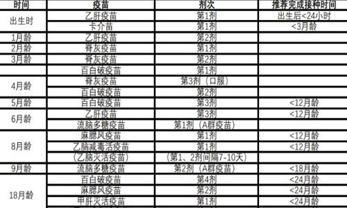 注意:上表所列各疫苗剂次的接种时间,是指可以接种该剂次疫苗的最小年龄,建议适龄儿童应尽早接种。未按照推荐年龄完成国家免疫规划规定剂次接种的小于18周岁人群,应尽早进行补种,尽快完成全程接种。尤其对一些传染效率和基础传播系数较高的疾病,相应的疫苗要尽快补种,如百日咳、麻疹等;部分重点传染病的疫苗,如脊灰、乙肝等,以及一些呼吸道传染病的相关疫苗应尽快补种。