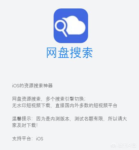 苹果端好用的网盘搜索工具,想必很多喜欢找网盘资源的小伙伴会有用,支持多种网盘类型,不限制敏感资源,搜索功能强大,福利站!因为是测试版本,所以大家先下先得吧~