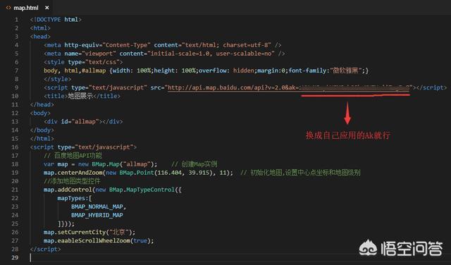 2.应用创建成功后,我们就可以在网页中引入地图了,代码其实很简单,主要是创建一个div容器,然后通过JS导入地图,完整代码如下: