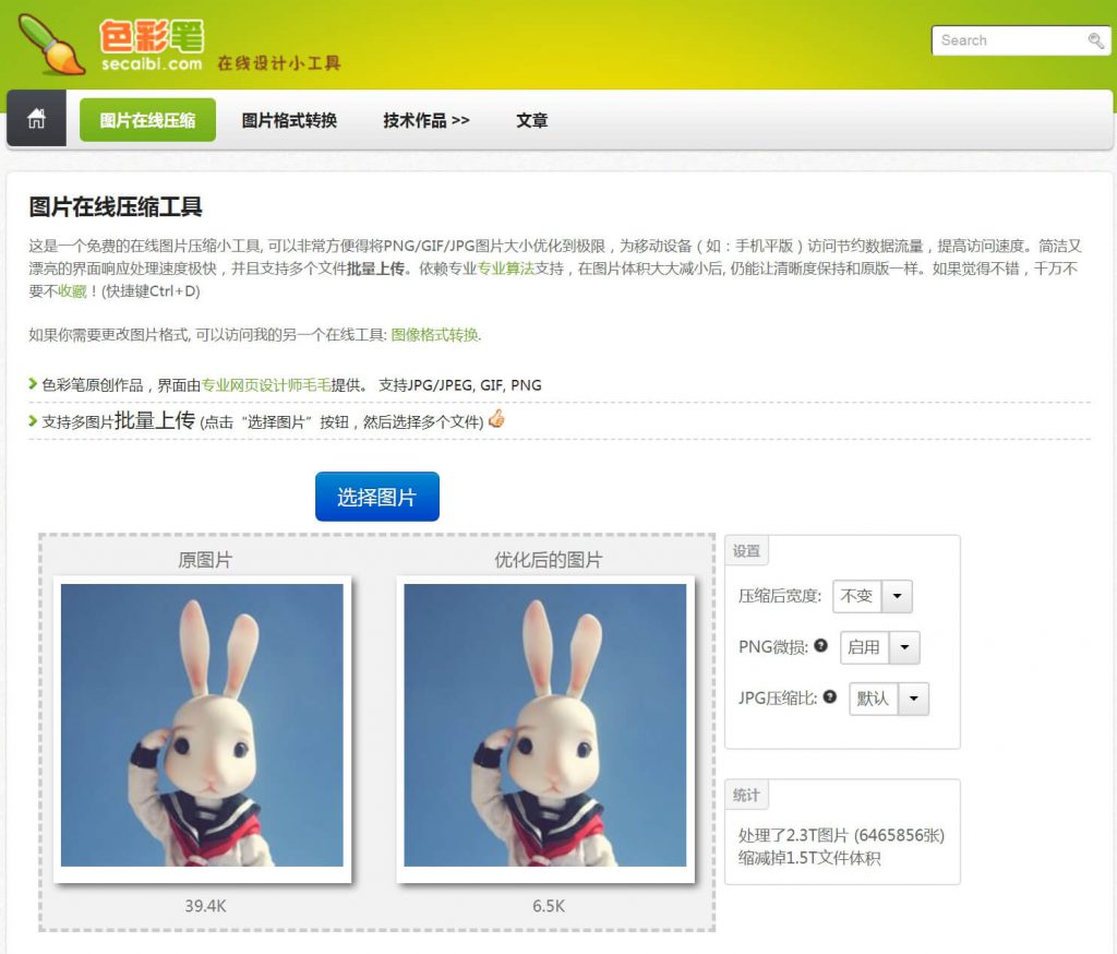 色彩笔是一个免费的在线图片压缩小工具, 可以非常方便得将PNG/GIF/JPG图片大小优化到极限,为网站访问节约数据流量,提高访问速度。简洁又漂亮的界面响应处理速度极快,并且支持多个文件批量上传。依赖专业专业算法支持,在图片体积大大减小后, 仍能让清晰度保持和原版一样。